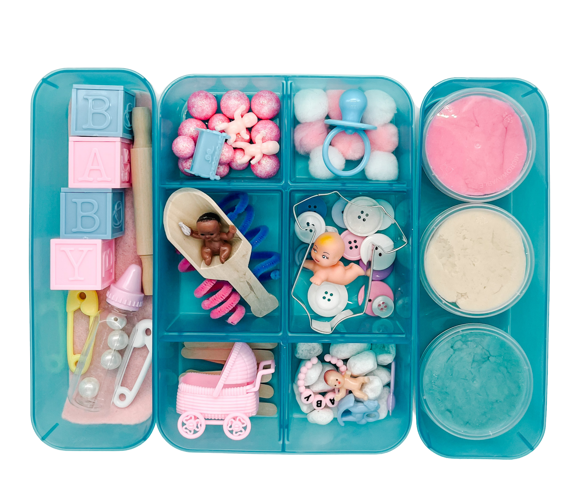 The baby bin makes us want to squeal with excitement! This bin is the PERFECT gift for an older sibling with a new baby in the house! Feed the babies bottles, give them a paci, or take them on a walk in the stroller. You can even build them a crib with the mini craft sticks!