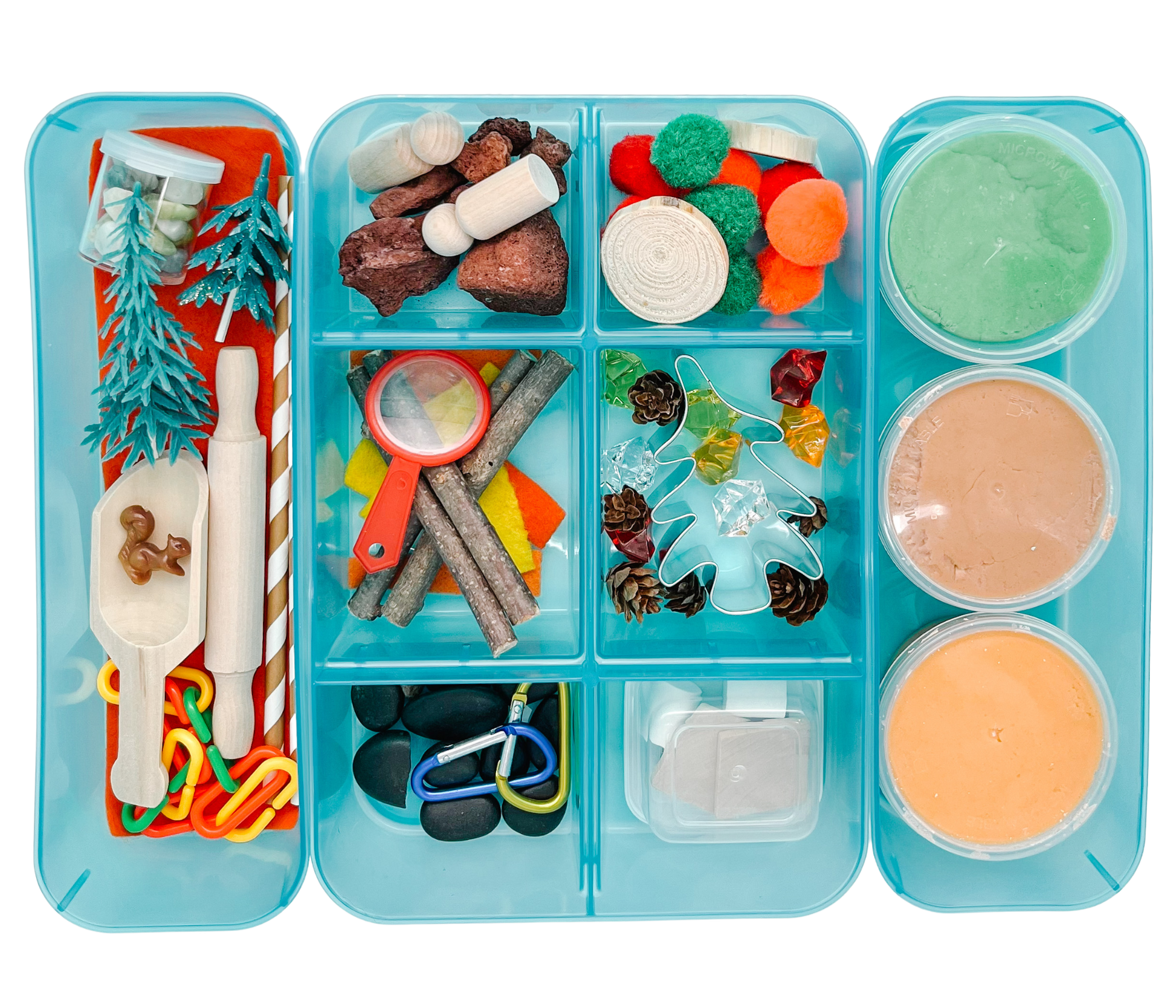 Get lost in the woods with our ADORABLE camping bin! A fan favorite, the camping bin will really open your child’s creativity. Build a campfire multiple ways, settle into the tent to sleep, look at a squirrel under a magnifying glass. There are SO many textures in this bin for them to explore and lots of natural elements.