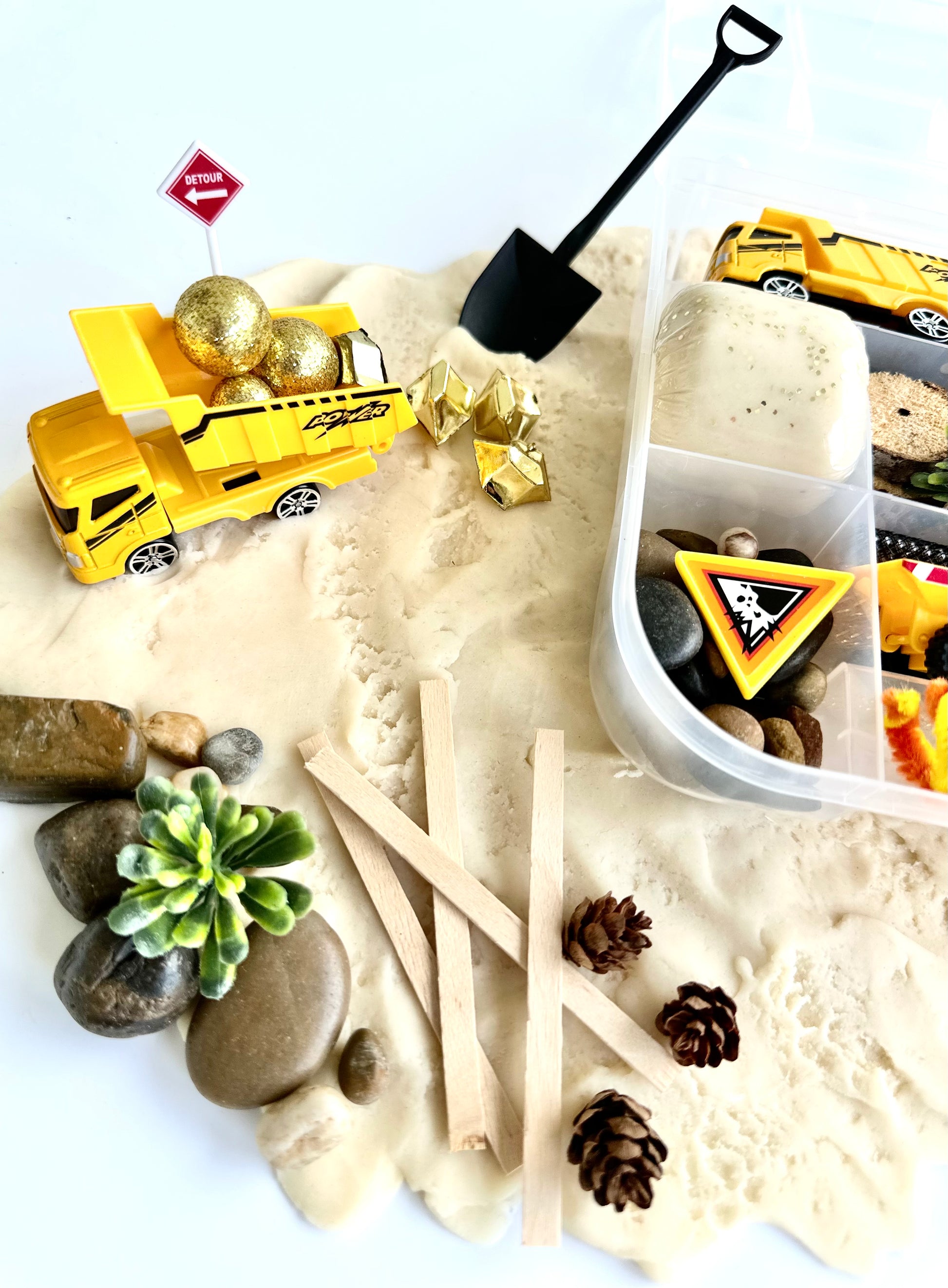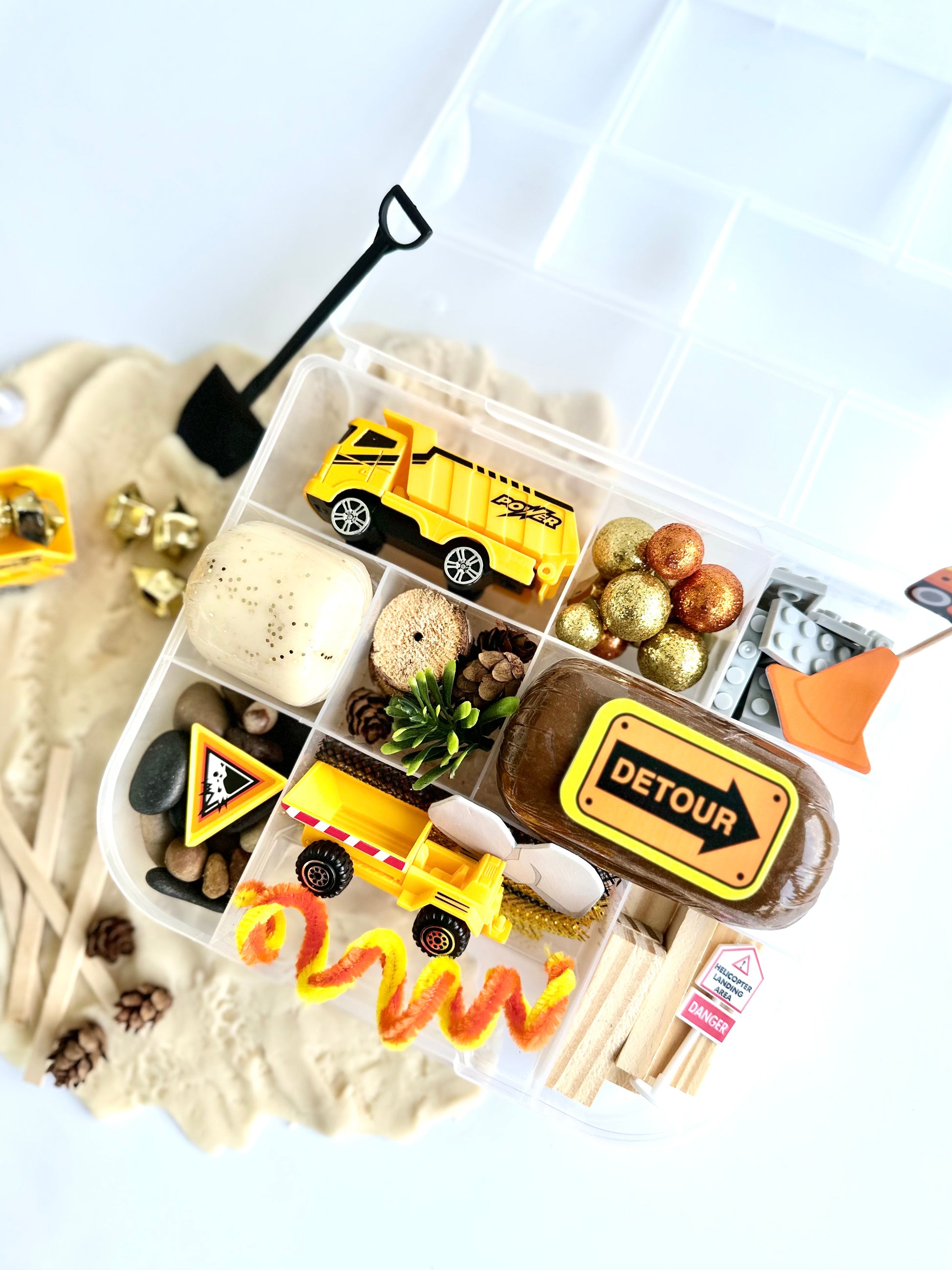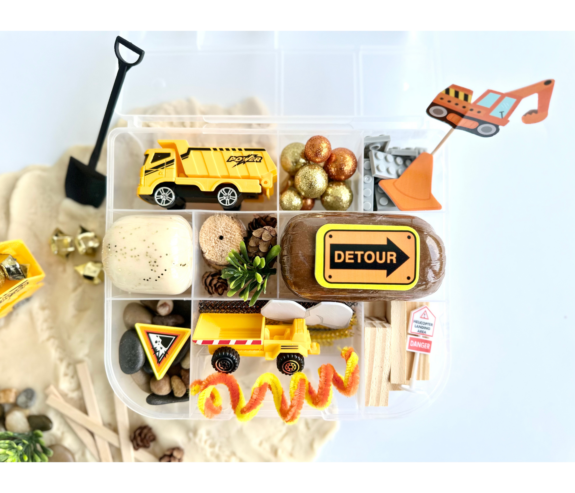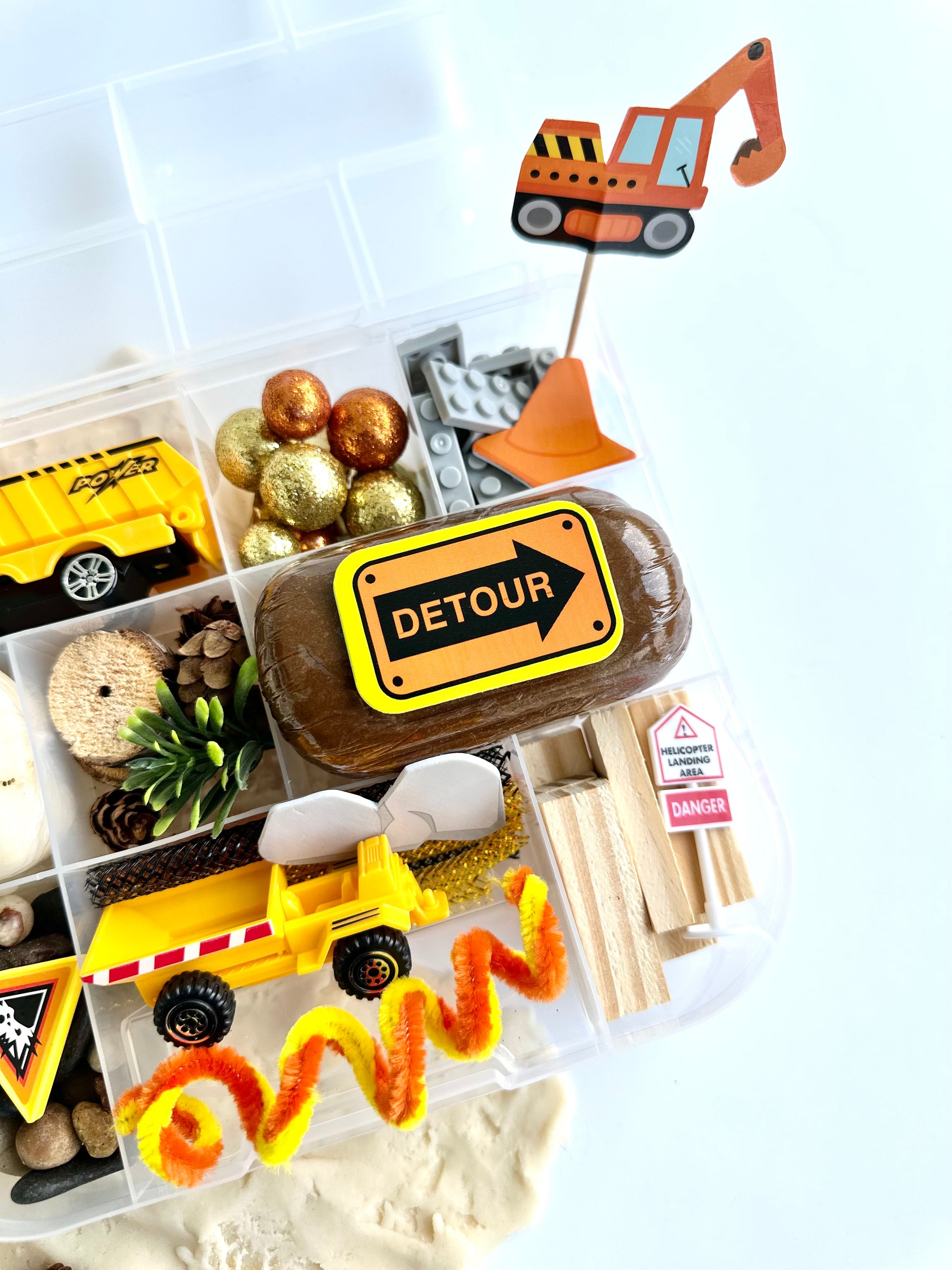 It’s time to build with some really unique items in our Construction bin! We included lots of real wood and natural elements to make your little construction zone feel as cool and real as possible! You won’t believe the things your little one will create with this bin!