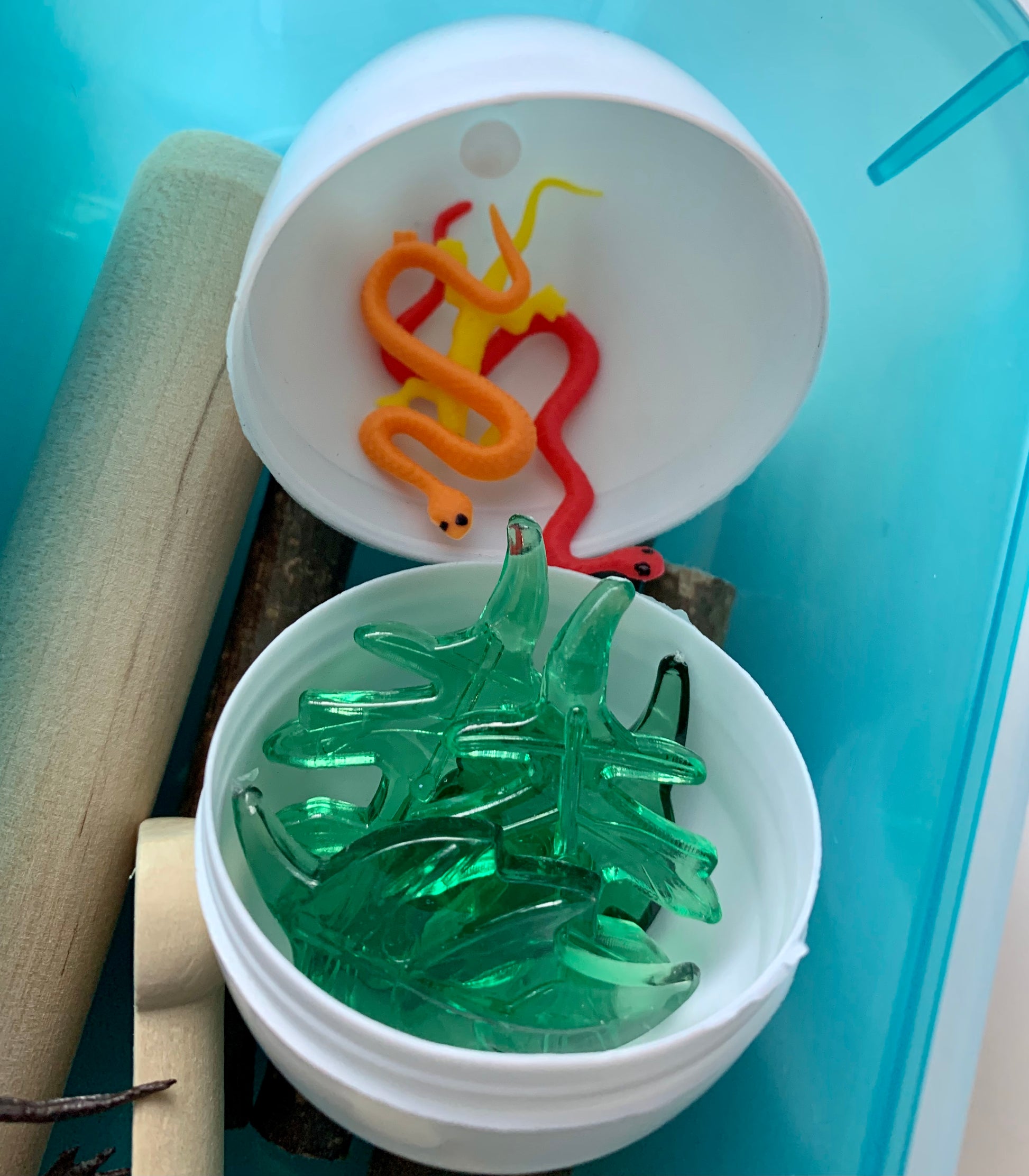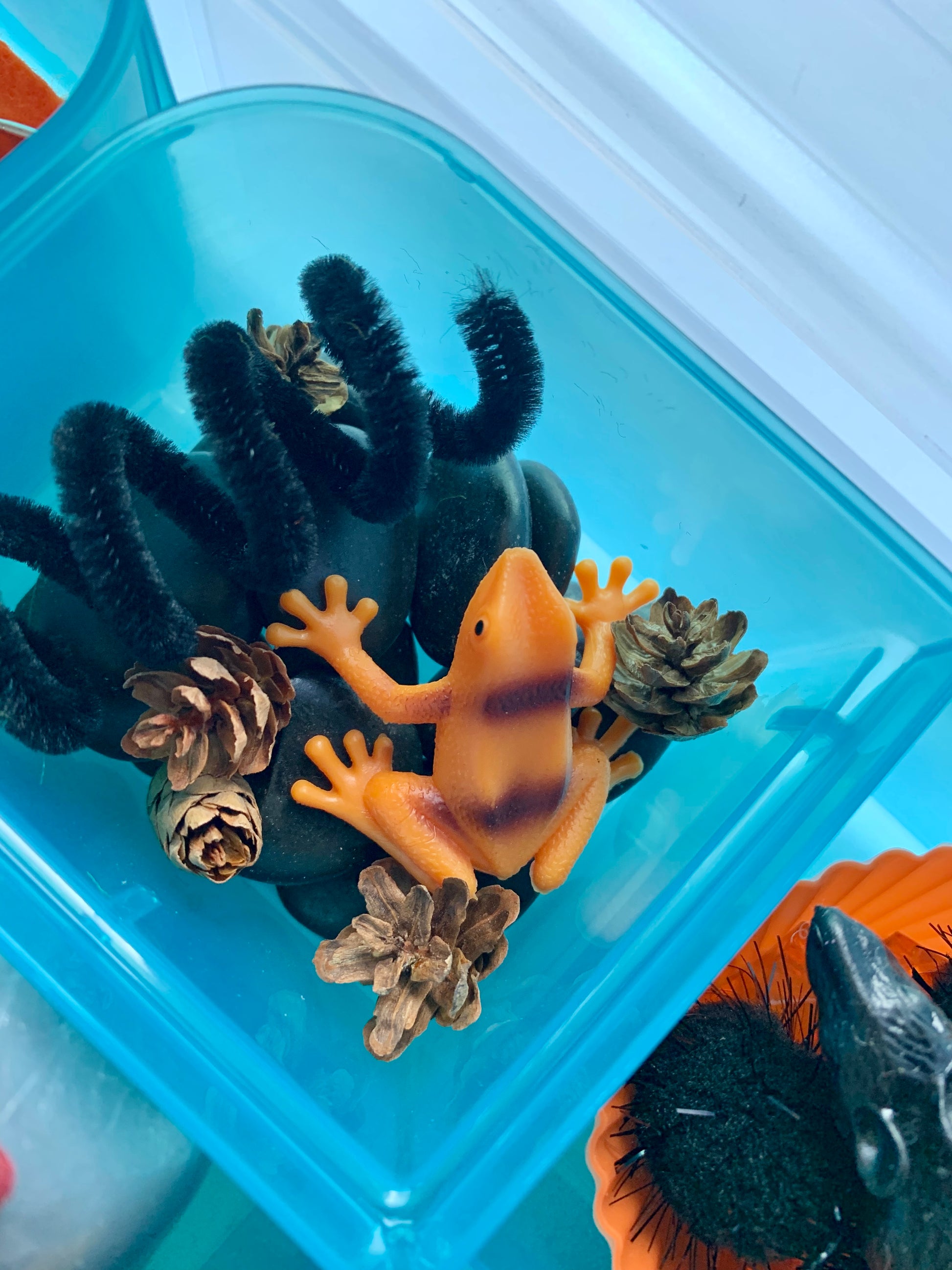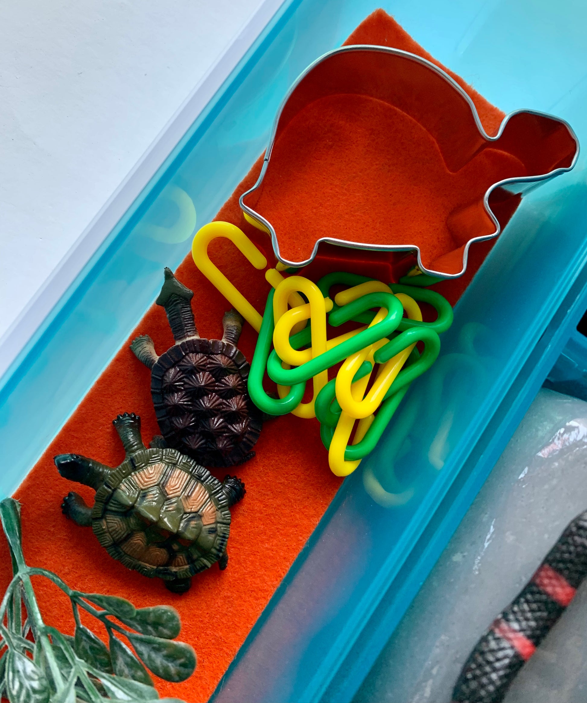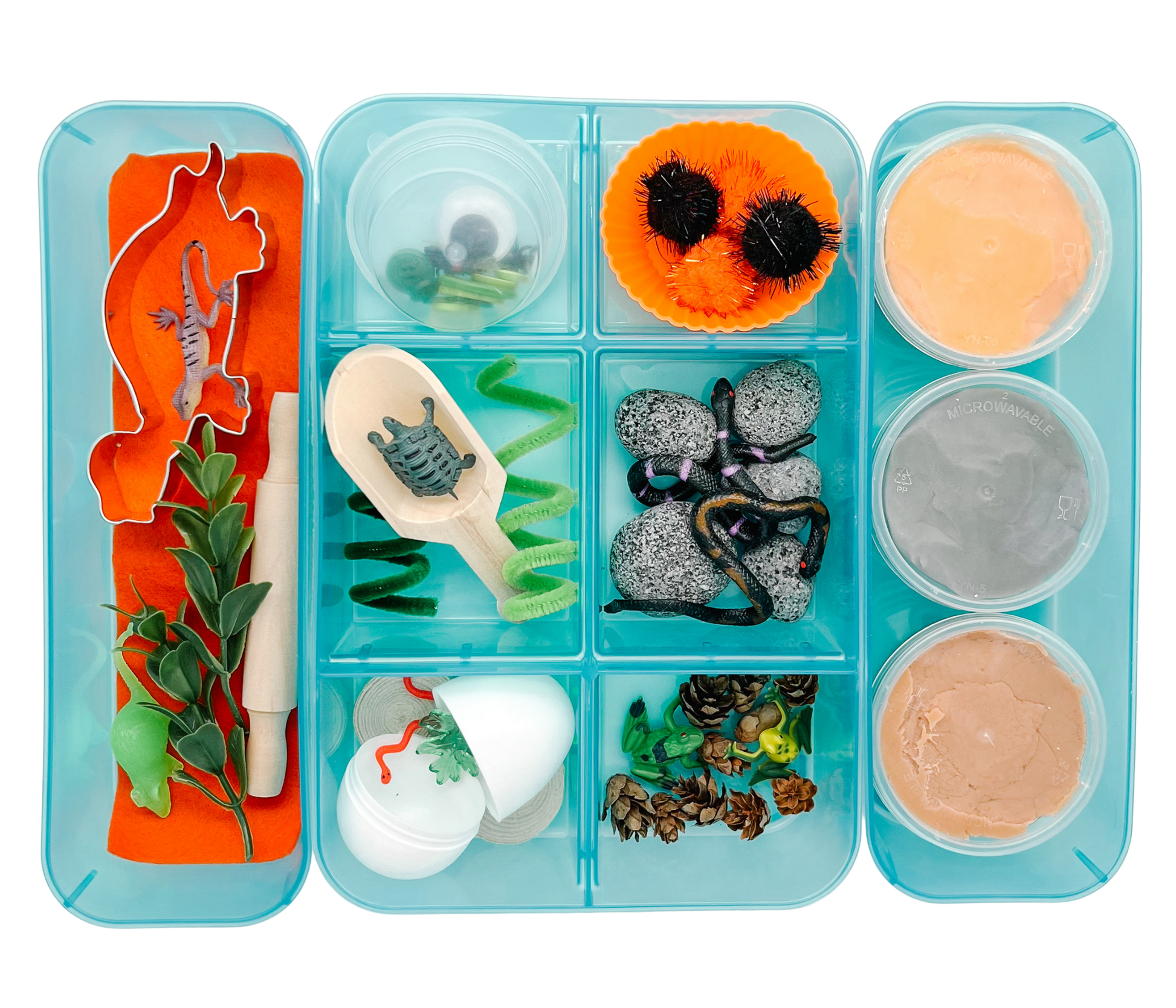 Snakes, frogs & turtles, oh MY! Kids get to create and imagine their ultimate habitat for all things reptiles with this Creepy Crawly Bin! With over 10 different textures to explore in this bin, your little reptile fans will be busy for hours!