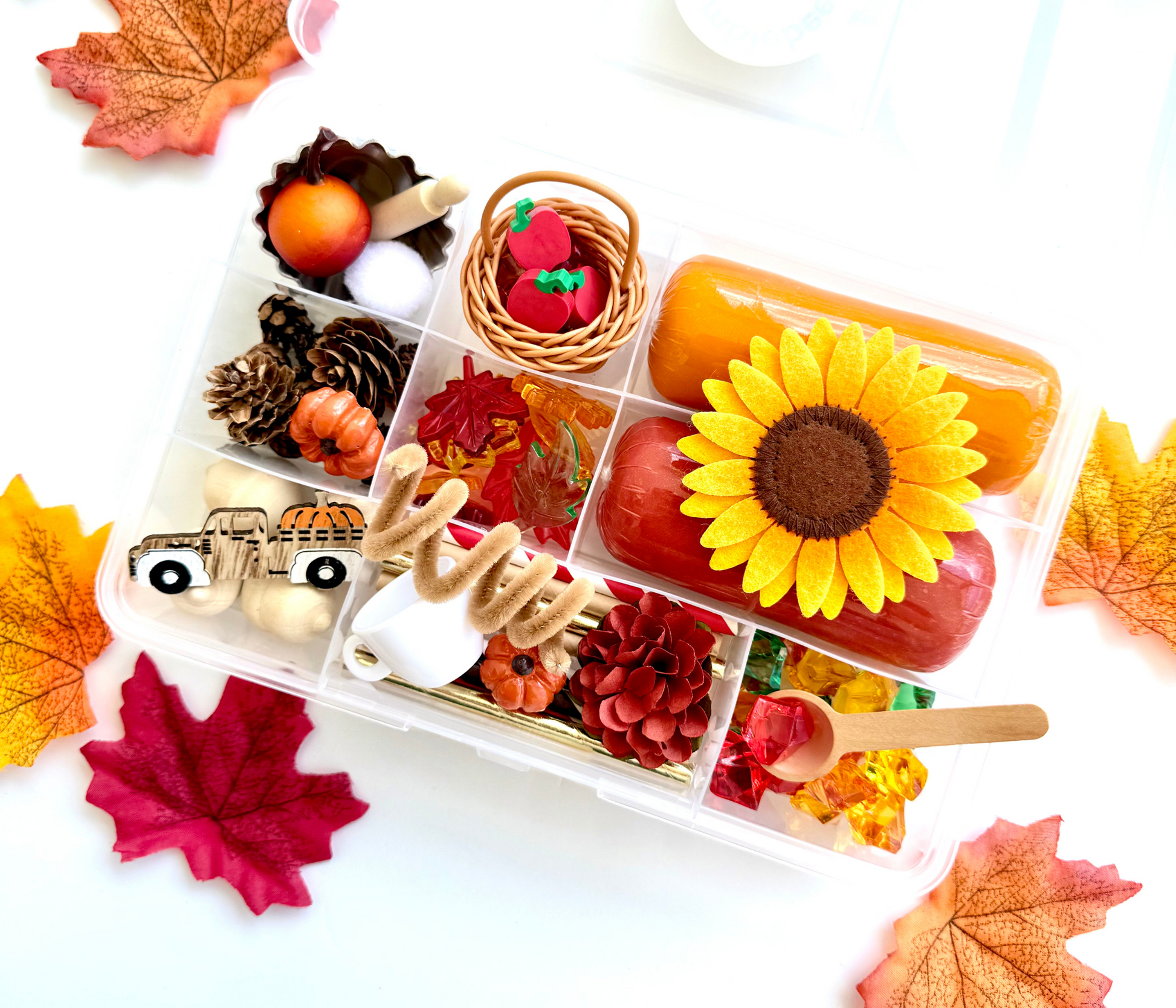 Our fall themed playdough bin is a seasonal, sensory play bin designed to capture the beauty and essence of autumn. Pumpkin and apple pies. Apple picking. Pumpkin spice lattes. Enjoy all season long! It features playdough in rich fall colors like orange and red. The bin comes with fall-inspired accessories like leaves and acorns, mini pumpkins, and pinecones for texture play. Your next fall play date, Friendsgiving, Thanksgiving or time traveling will be SO much more lovely with our Fall bin!