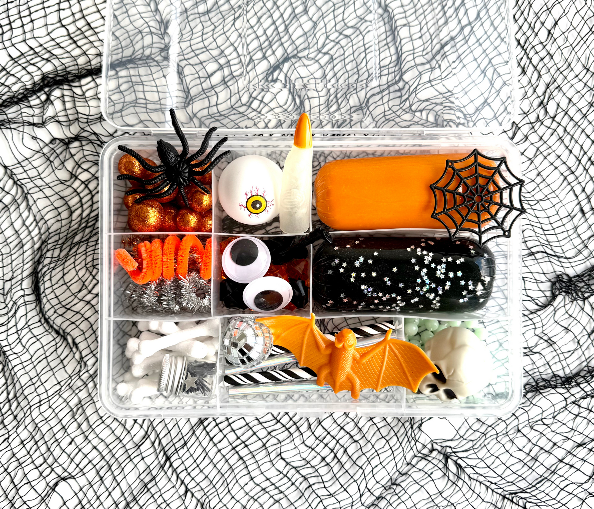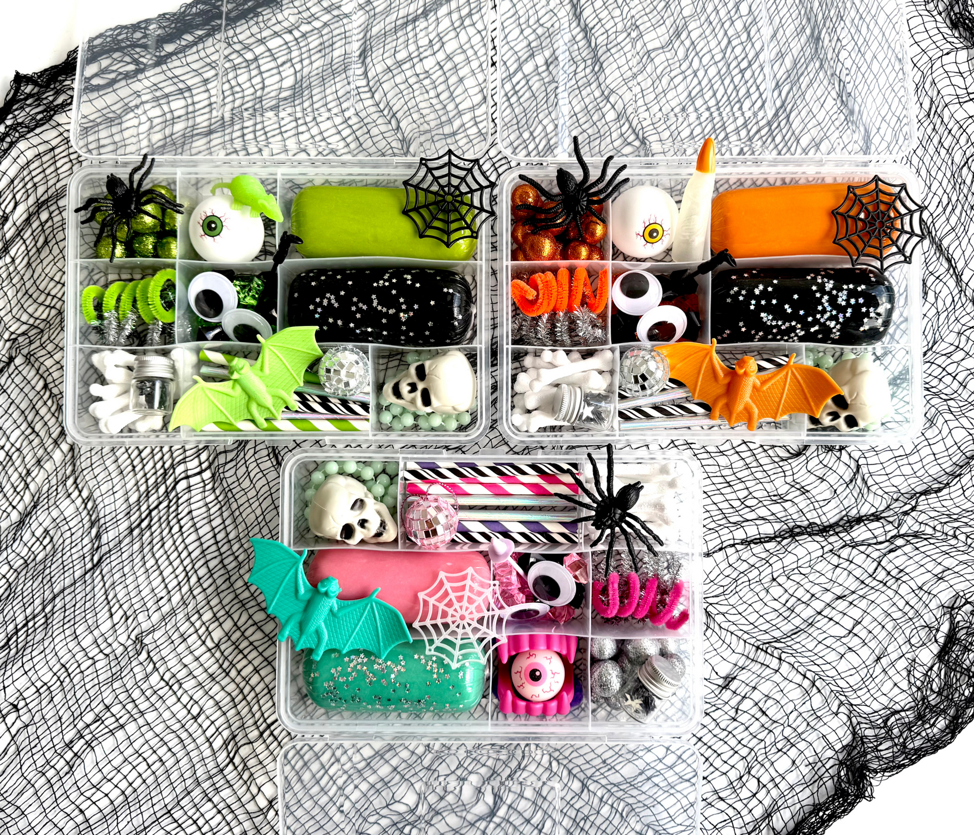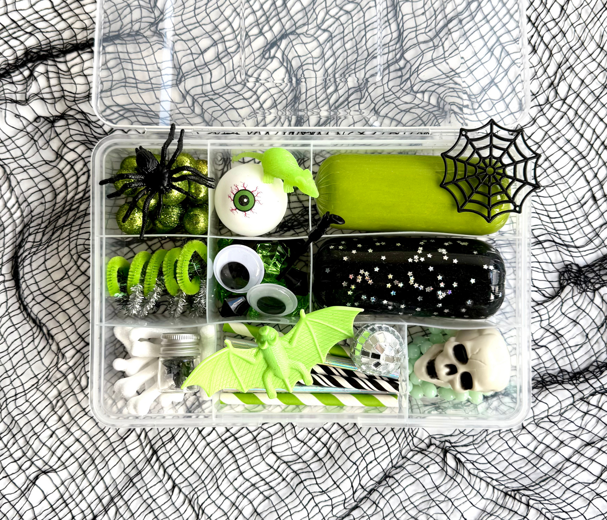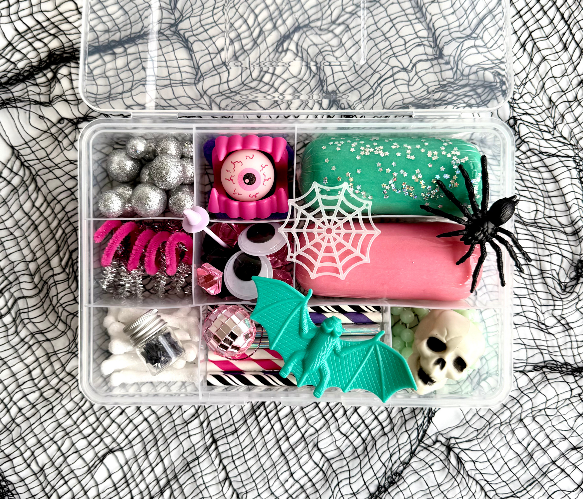 Boo! Did we scare you? Our Halloween bin is NOT overly creepy, so you can rest assured your little ones will have nothing but fun with this silly bin! Tons of themed loose parts to create all the fun Halloween scenes, with a touch of disco magic! 🪩 Available in 3 colorways!