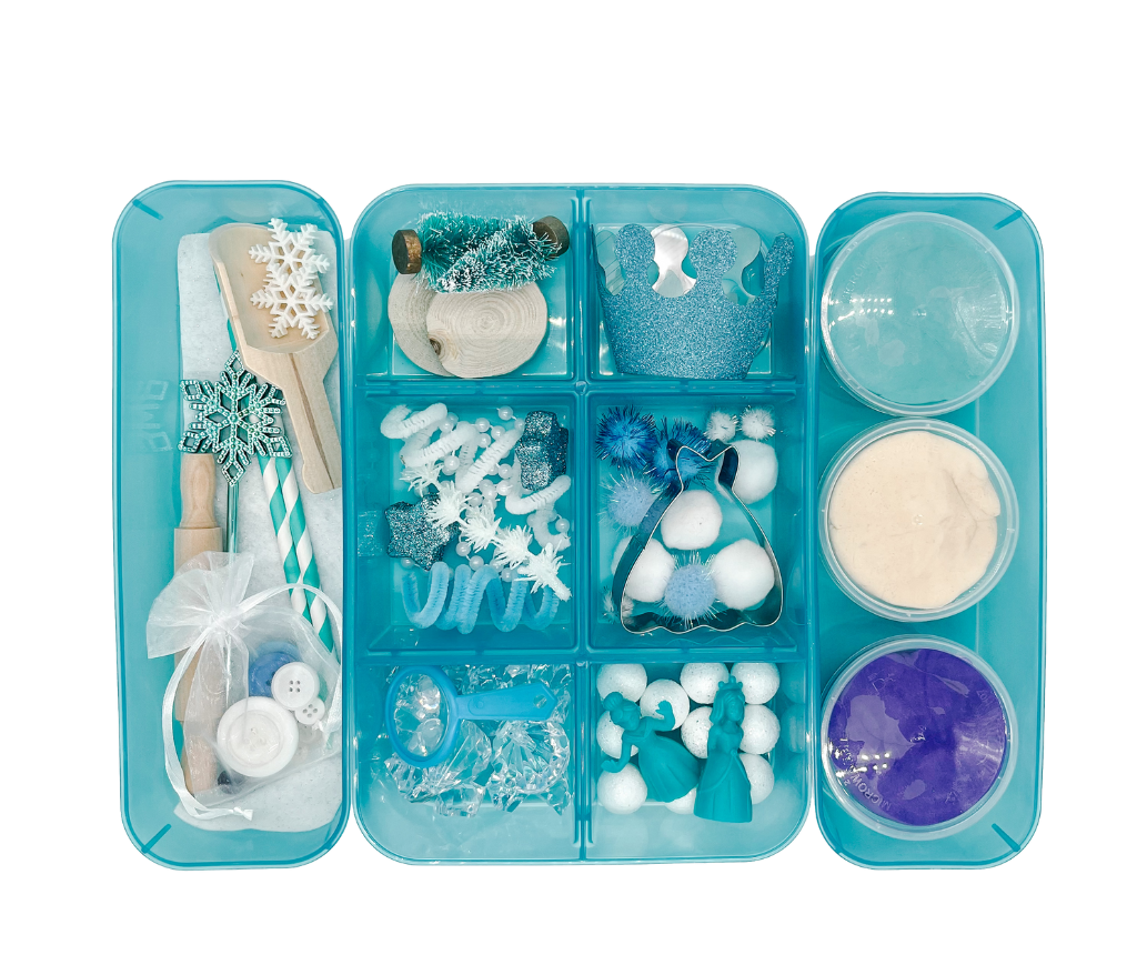 It’s time to get ready for the *winter* ball! Cut out a gown and put all the bling on it! Train the little princesses in the way of all things royal. Let your little one’s imagination dream of all things frozen and fancy with this bin!