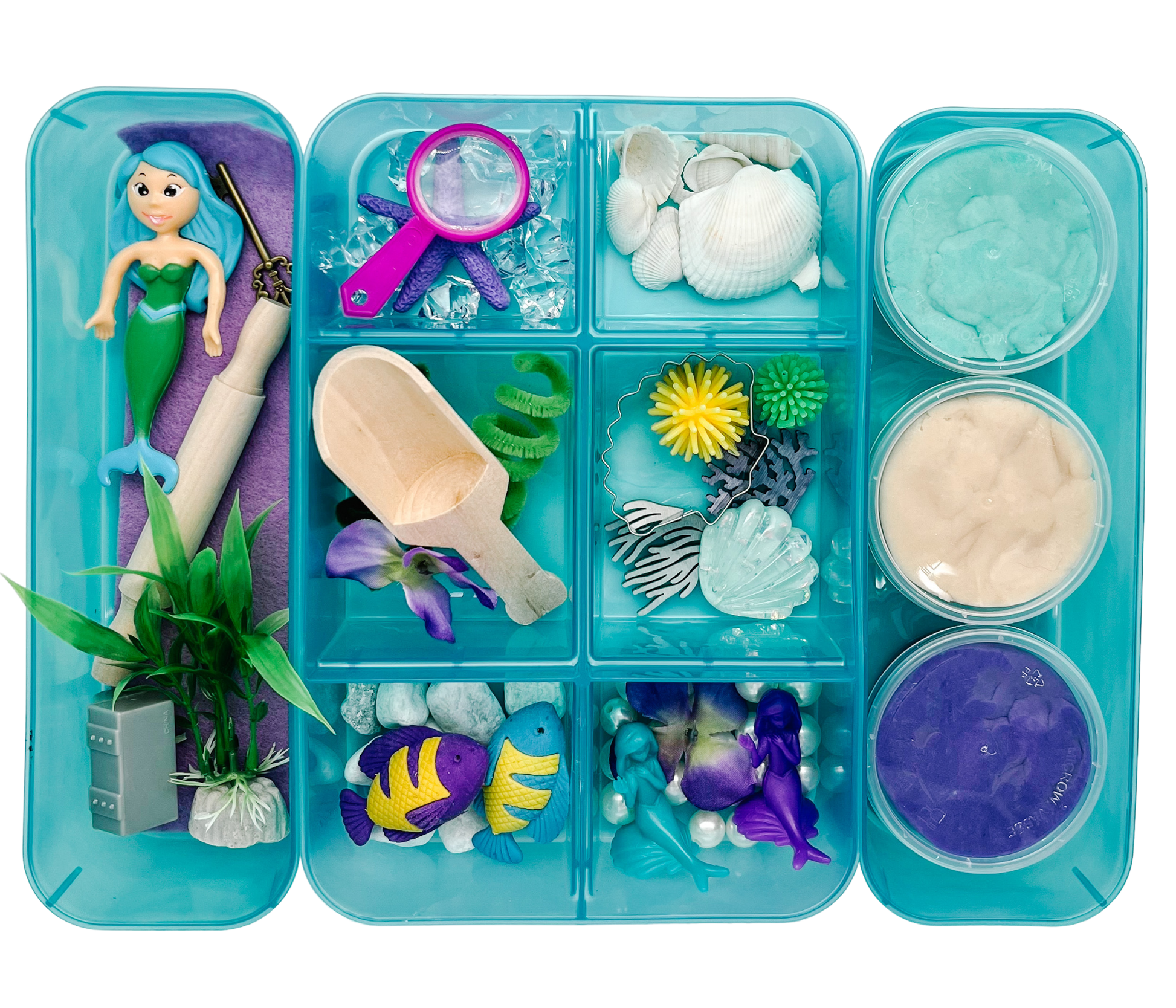 Jump into the underwater world of mermaids! This bin is dazzling for your little ones who are fascinated by the ocean. Treasures, shells, seaweed and sea life abound in this bin!