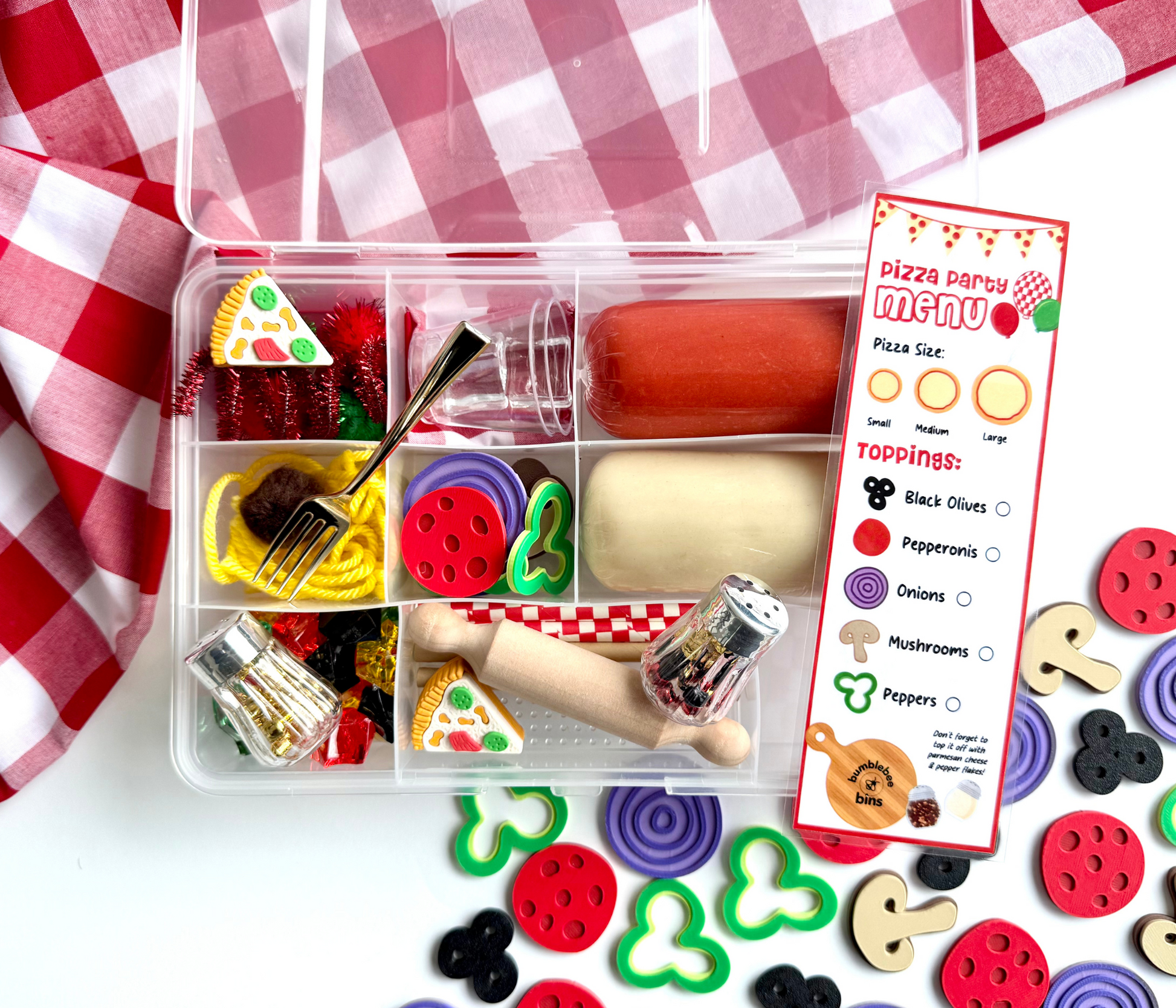 Bring the pizzeria home with this Pizza Party Bin! Kids can roll out dough, spread on “sauce,” sprinkle on cheese, and add their favorite toppings to create the perfect pretend pizza. This hands-on bin encourages imaginative play, sensory exploration, and creativity. Perfect for pizza lovers, pretend chefs, and little restaurant owners in training!