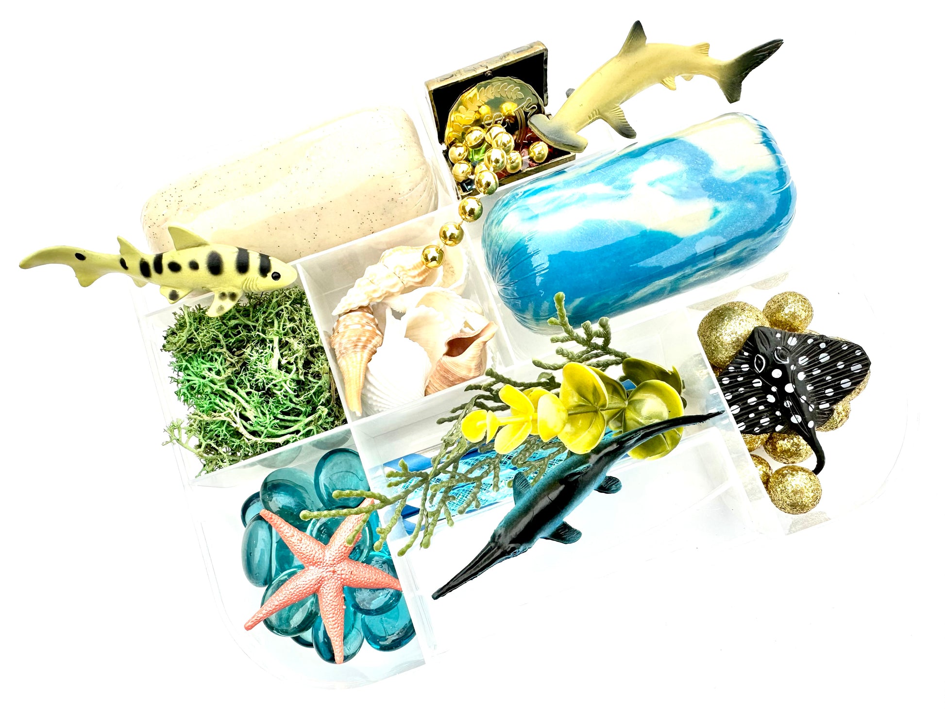 You might want to stay on the boat for this one! Or do you prefer the cage for shark diving? These shark figurines are so detailed you can even look up the species in books! Lots of fun underwater play to be had in this bin.