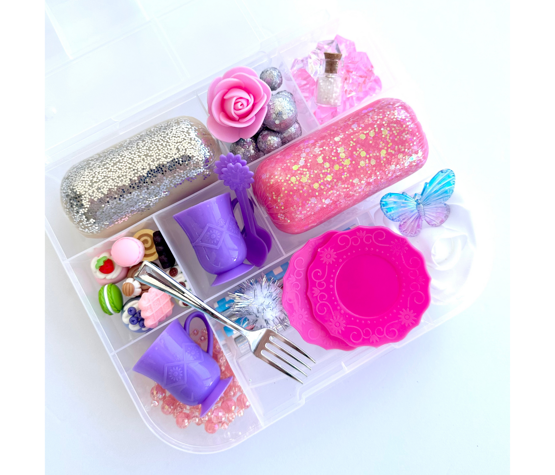 Tea party for two please! Enjoy a cup of tea with some yummy desserts on the side! Don’t forget to add a dash of sugar to your drink and stir! This bin is full of different textures that will be fun to play with in the dough. Possibilities are endless!
