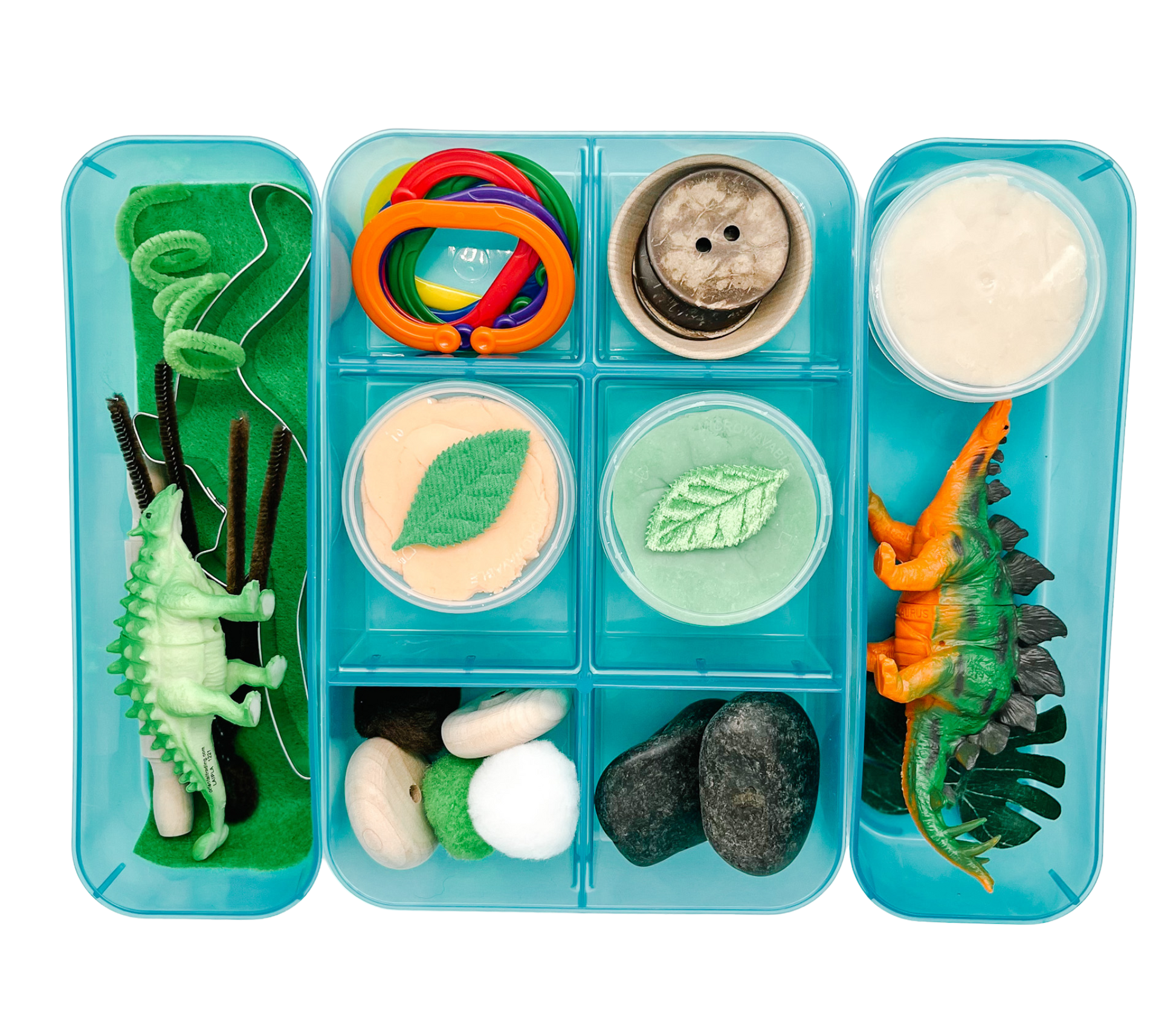 Let's go back in time together to the land of the dinosaurs! Let your toddler transform into a mini archaeologist as they stomp and feed the dinosaurs and create endless adventures with this bin.