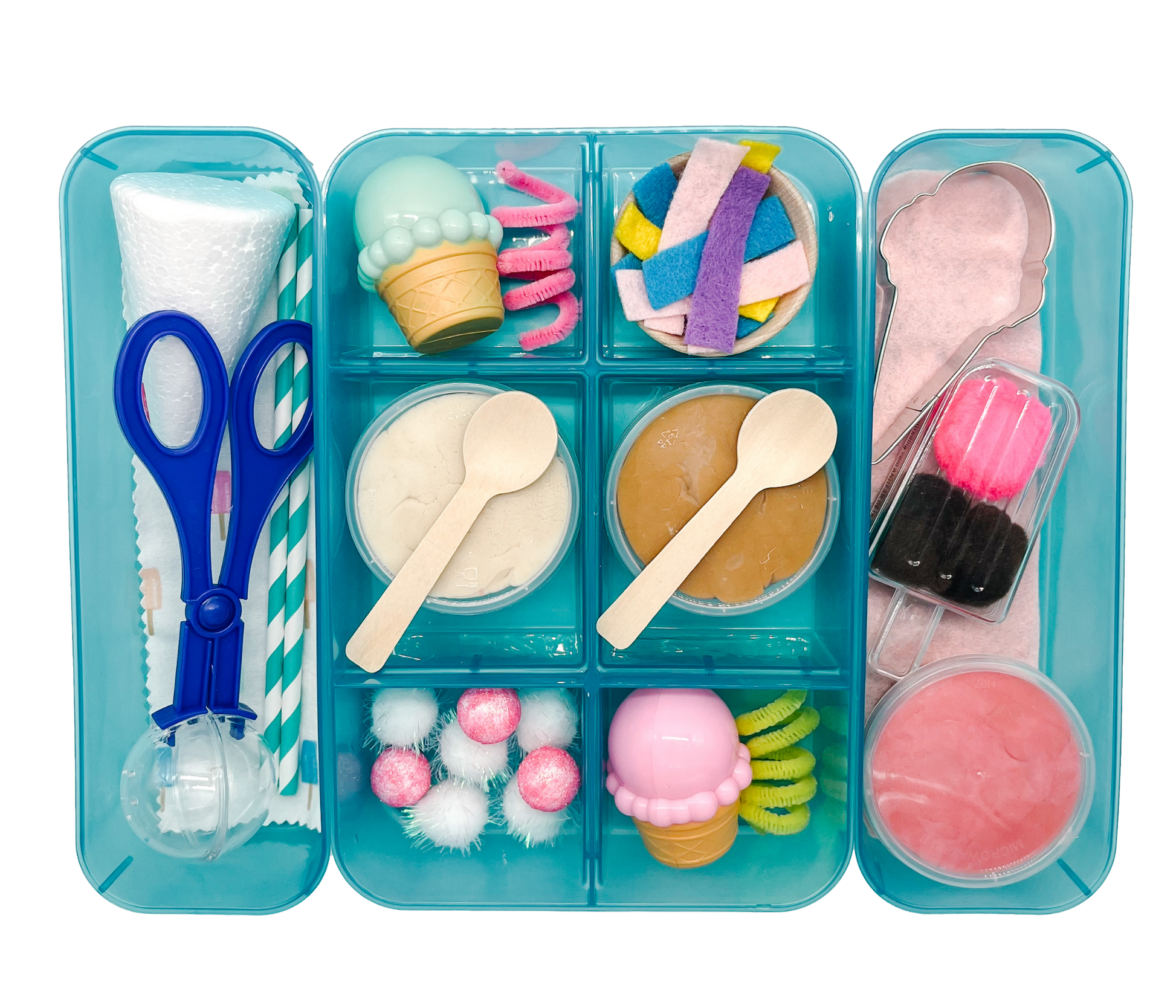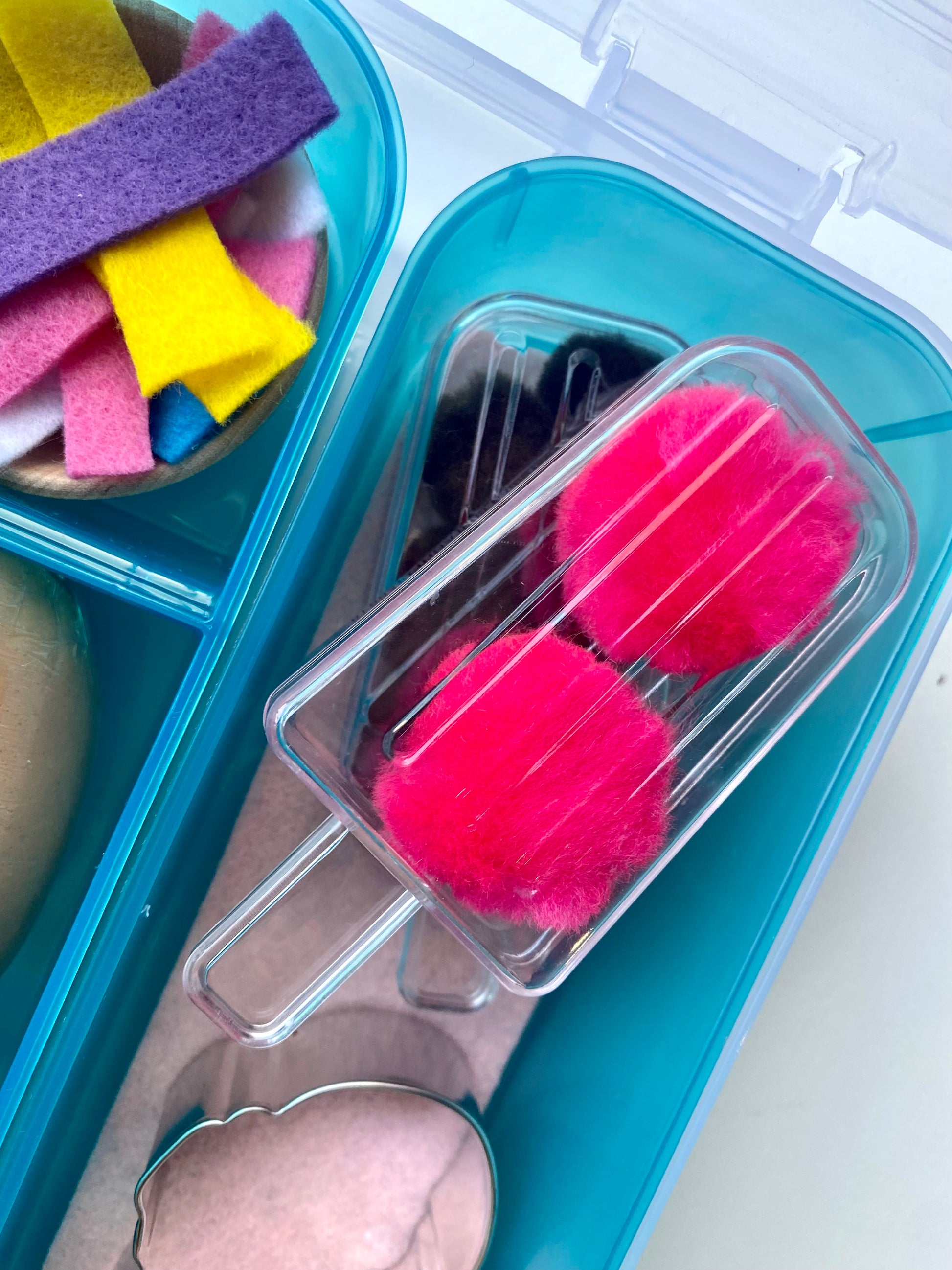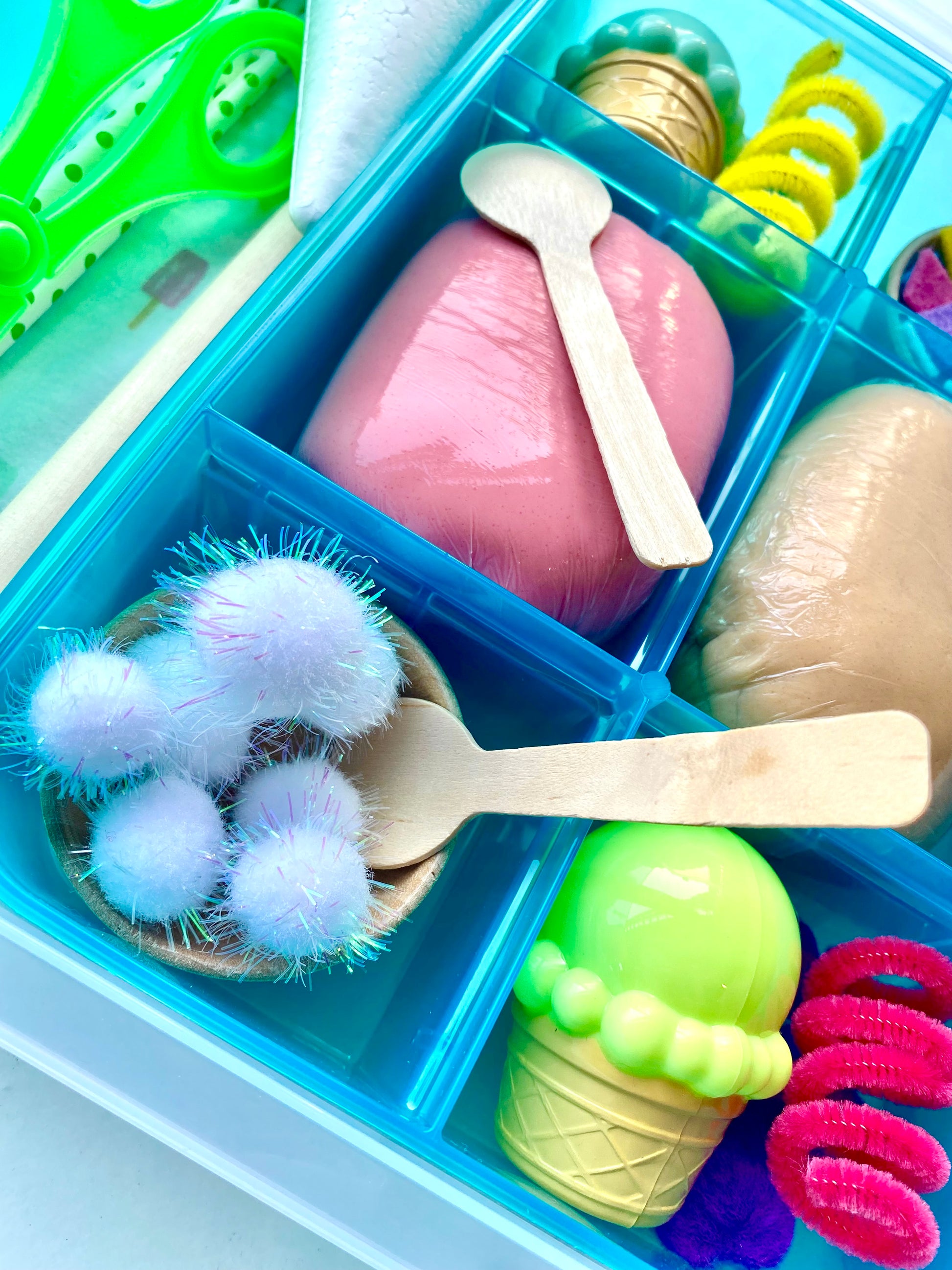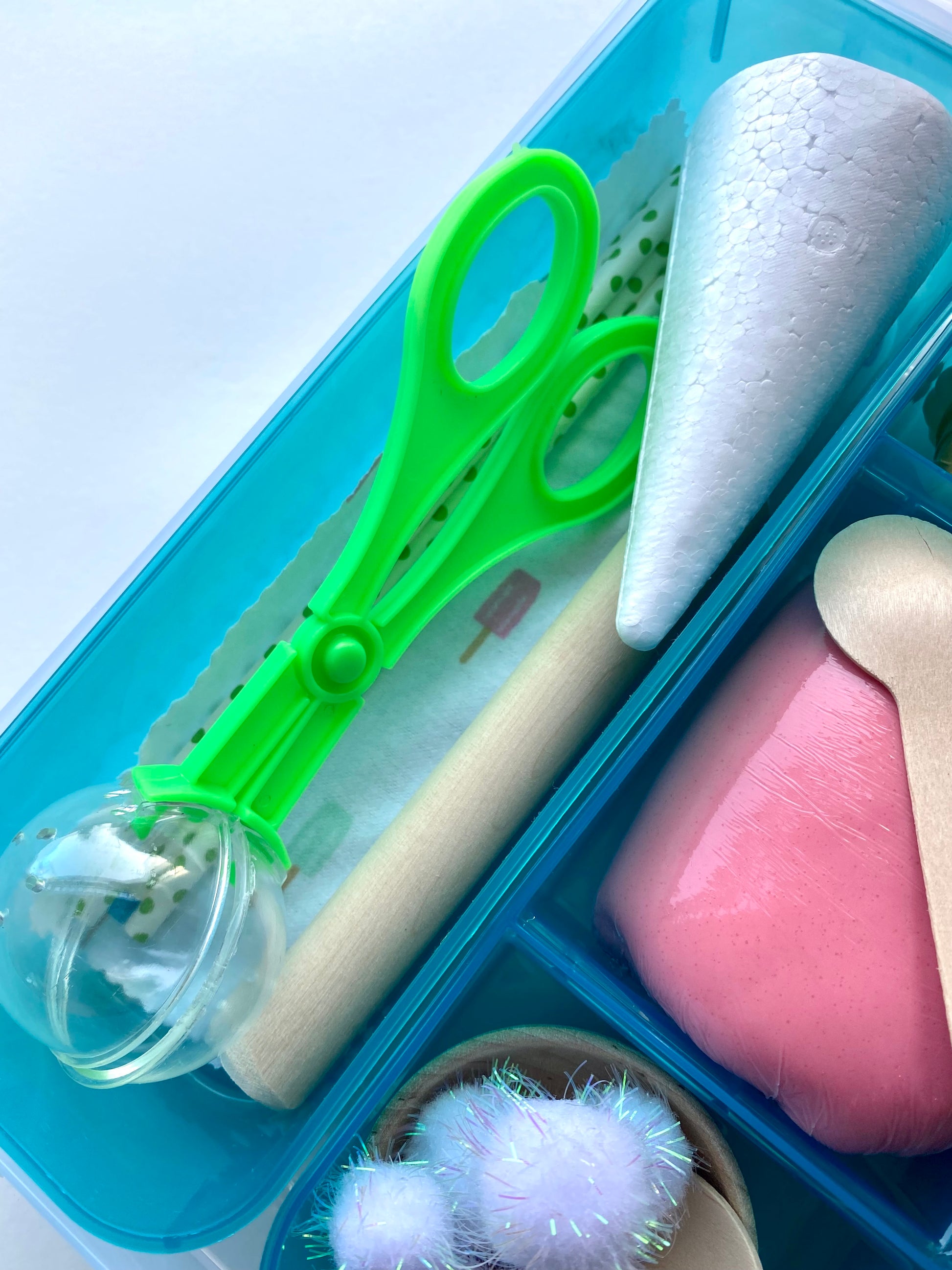 I scream, you scream, we all scream for Ice Cream! With Bumblebee Bins Toddler Ice Cream Sensory play dough bin, exploratory play for toddlers ages 18 months and up is easy and sweet! Ice Cream cone Easter eggs, an ice cream scoop and customizable popsicles are the highlights of this fun bin! Kids can make their own ice cream cones & popsicles, complete with felt "sprinkles."