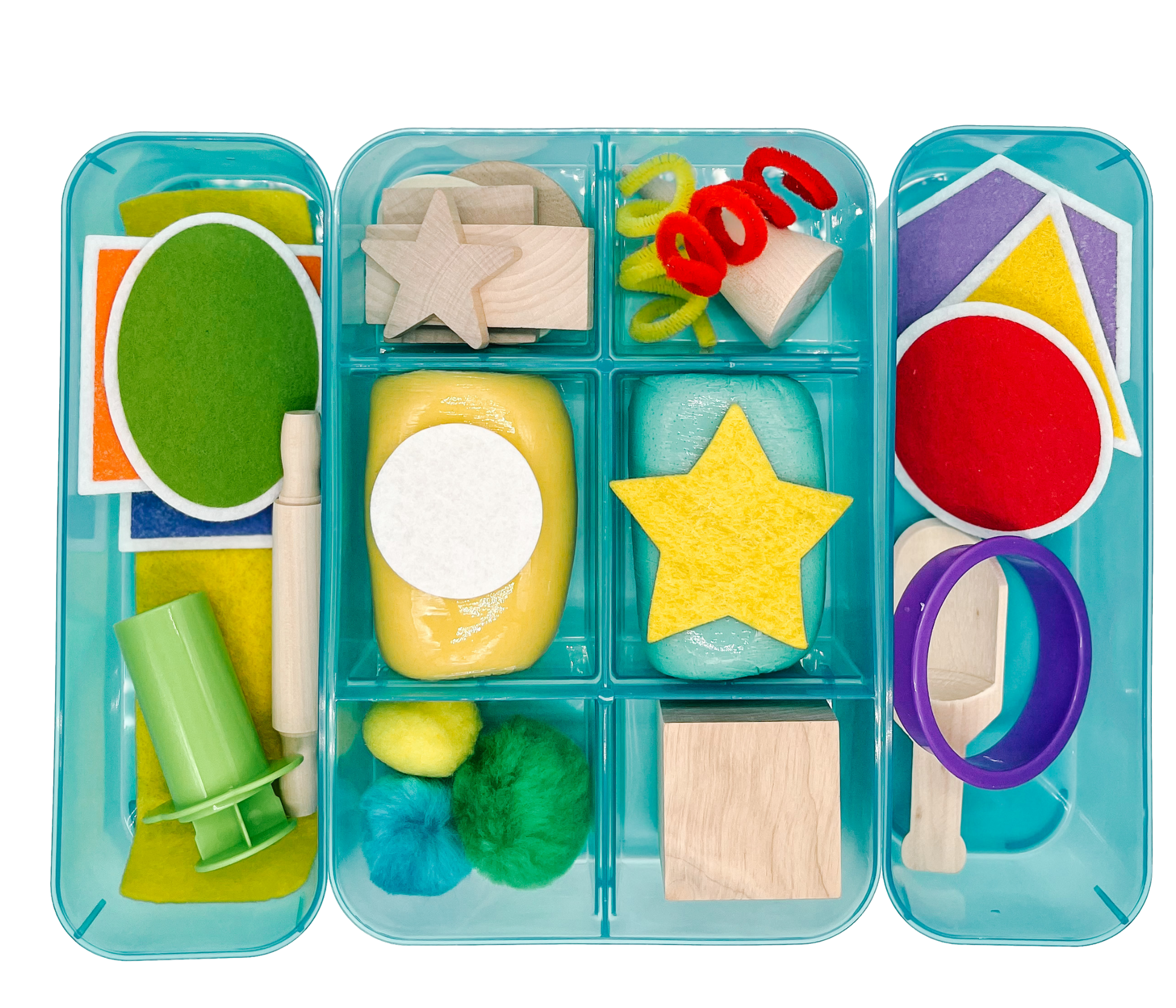 Teach your toddler all about circles, squares, triangles, and stars with the Shapes Bin! Filled with 2D and 3D shapes, your little one can sort, stack, and stamp shapes into play dough. What a fun way to learn!