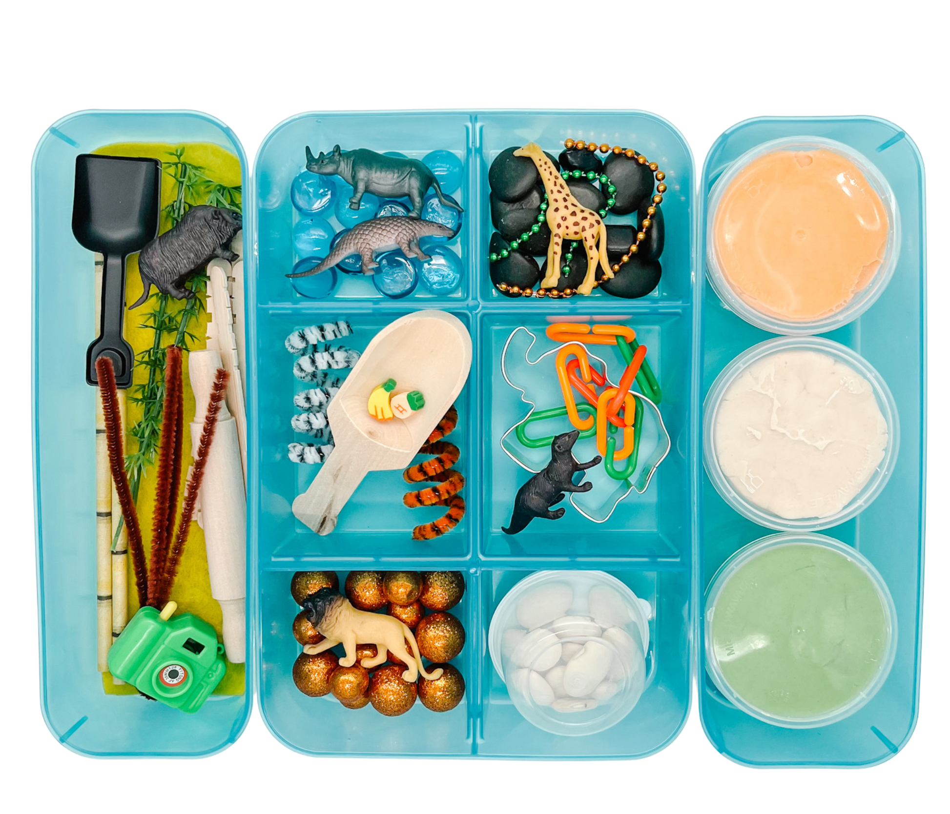 ROAR! It's time to explore! With the herd of wild animals in our this bin, your little ones will be captivated for hours. Pretend to be a zookeeper or safari explorer and build habitats for the animals, feed them, and more! Animals fascinate kids of all ages, and this bin is sure to be a favorite!